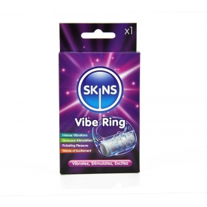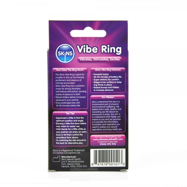 Skins Vibe ring retail pack with a handy loop on the top to be hung on shelves. Enjoy good vibrations & sensuous stimulation with this super stretchy ring powerfully motored for enhanced vibration. Batteries included